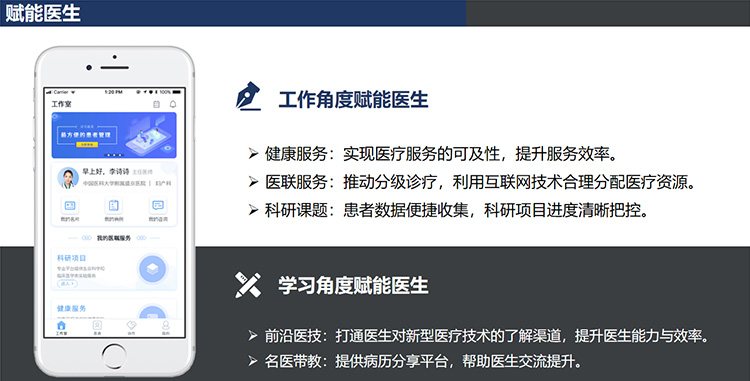 有口碑:医嘱实时落地,服务全面跟进,有效提升治疗效果,提高患者满意度。 有效率:病历数据轻松获取,疑难病患一键转诊,患者病历自动同步。 有成果:数据采集简单易行,科研过程全程监管,轻松做科研。 有提升:名医带教,病例分享,沟通临床经验、学习最前沿的医疗技术,实现医技提升。 有收入:个性化健康服务、教育课程,实现合理分成,带来持续经济收入。 |