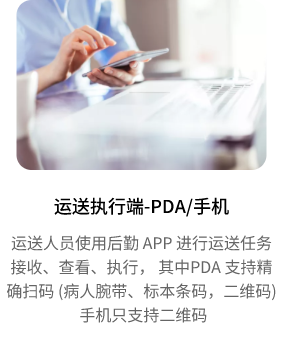 运送执行 终端设备扫描手腕带和标本条码,确保运送对象无误,提供蓝牙,NFC标签等方式进行任务执行节点触发。